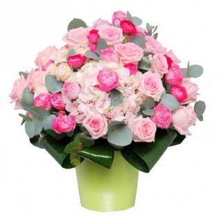 3. Aranjament cu hortensie, trandafiri, minirose, lisianthus