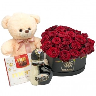 - Cutie cu trandafiri rosii, ursulet de plus si lichior Sheridan's si ciocolata MerciLivrare in: Bucuresti si Ilfov