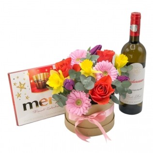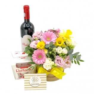 - Aranjament floral cu flori roz, albe si galbene cu bomboane Raffaello si o sticla de vin279,00 LeiLivrare in: Bucuresti si Ilfov